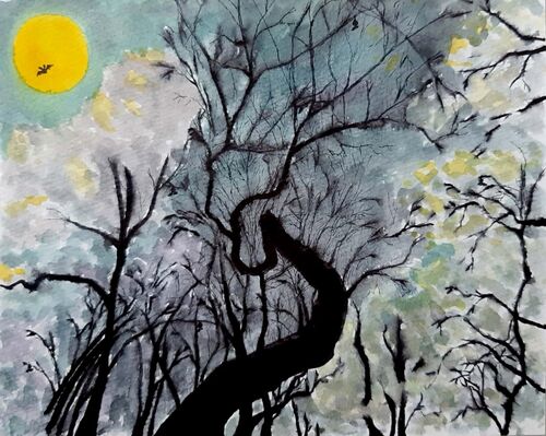 今回は105枚目に描いた水彩画を紹介します! 早速紹介します! 「コウモリの森」です。 コウモリさんが潜む森を水彩画にしました。 夜中に森に入り月を見上げたところをイメージして描きました。 森に不気味さを出すために全体的に滲ませてみたら意外といい感…